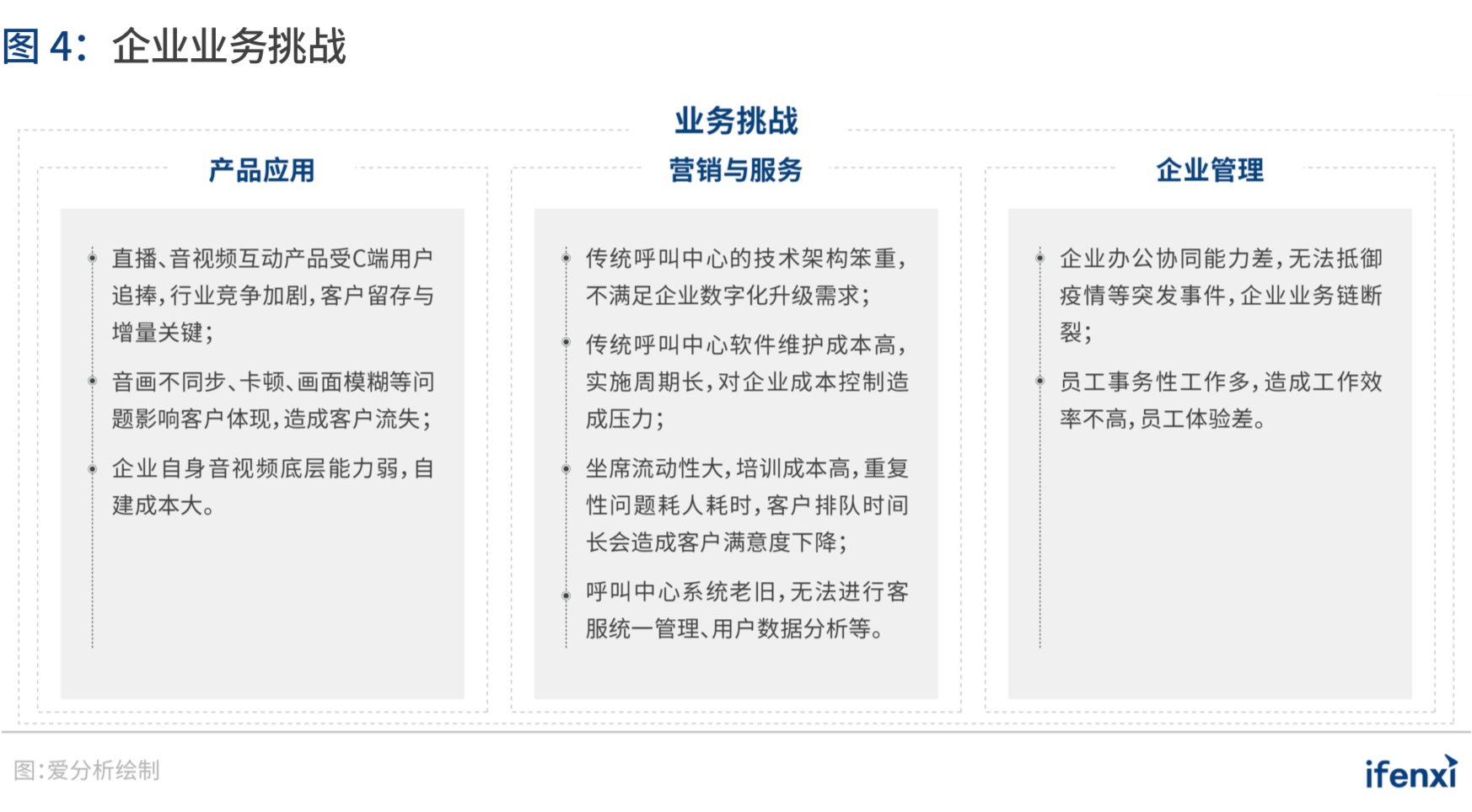 通讯能力成为企业发展的基础能力,为企业解决从内部运营到产品与服务创新过程中的交互问题。产业数字化加速,云计算技术应用进入成熟期,新的业务场景出现给了企业更多业务增长空间。