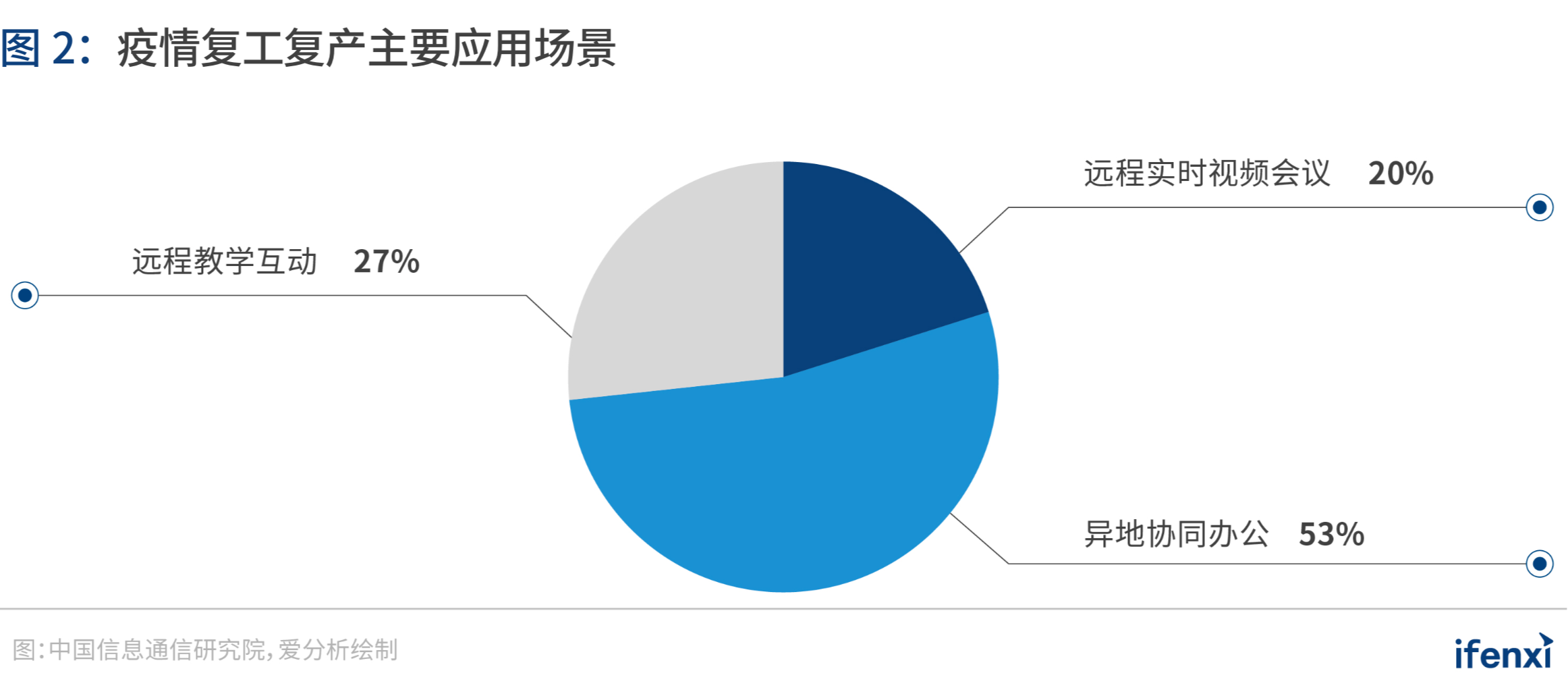 根据中国信通院的数据:复工复产新模式应用场景中主要包括远程实时视频会议、异地协同办公以及远程教学互动,在企业复工复产的应用中占比20%、53%和27%。