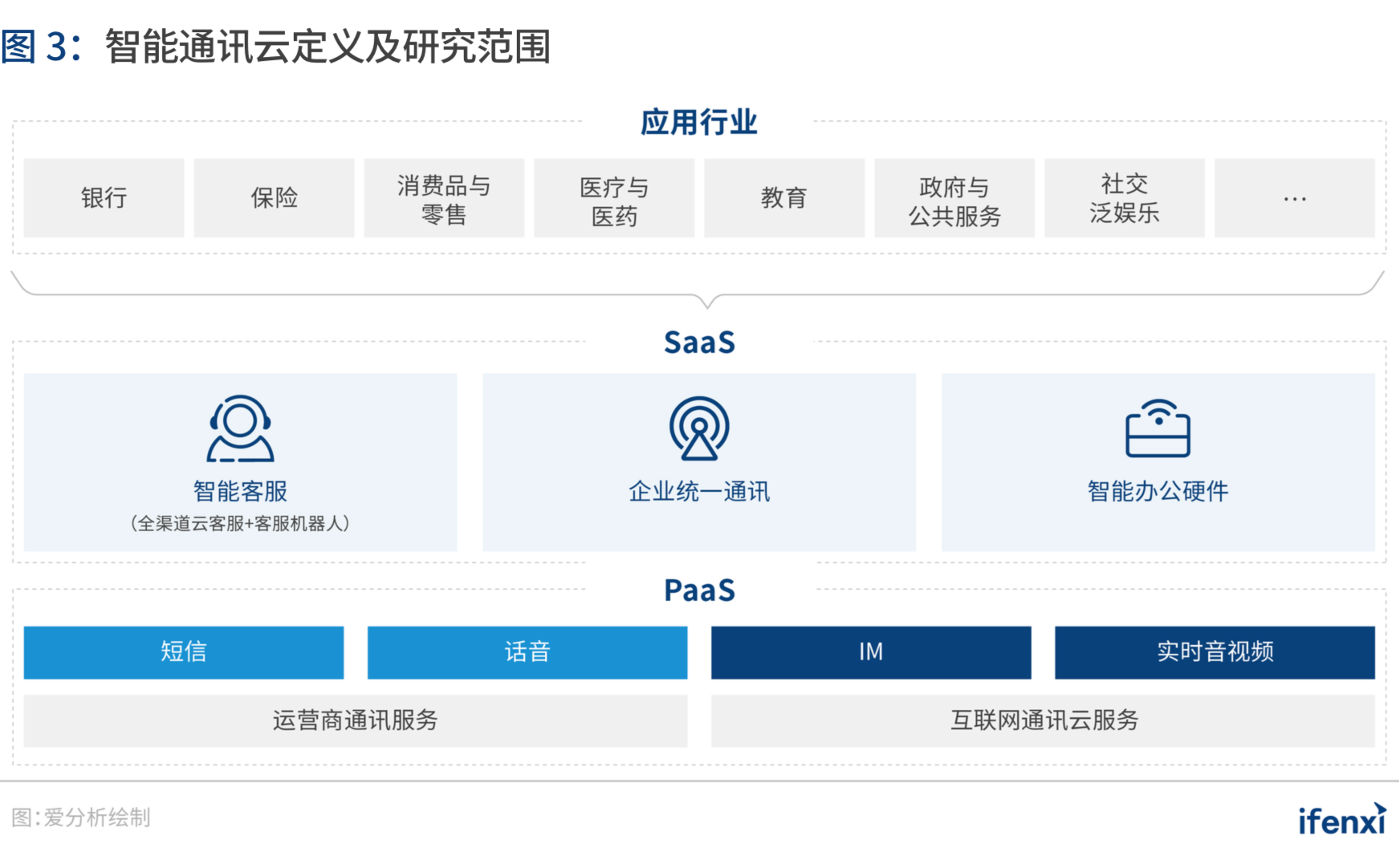 目前,智能通讯云应用主要集中在以API/SDK形式交付的PaaS层服务,包含短信、话音的传统运营商业务和IM、实时音视频的新型互联网业务;以及智能客服、企业统一通讯和智能办公硬件的SaaS层服务。其中,智能客服又分为全渠道云客服和客服机器人。本报告将就智能通讯云在PaaS层和SaaS层应用两大方向展开。
