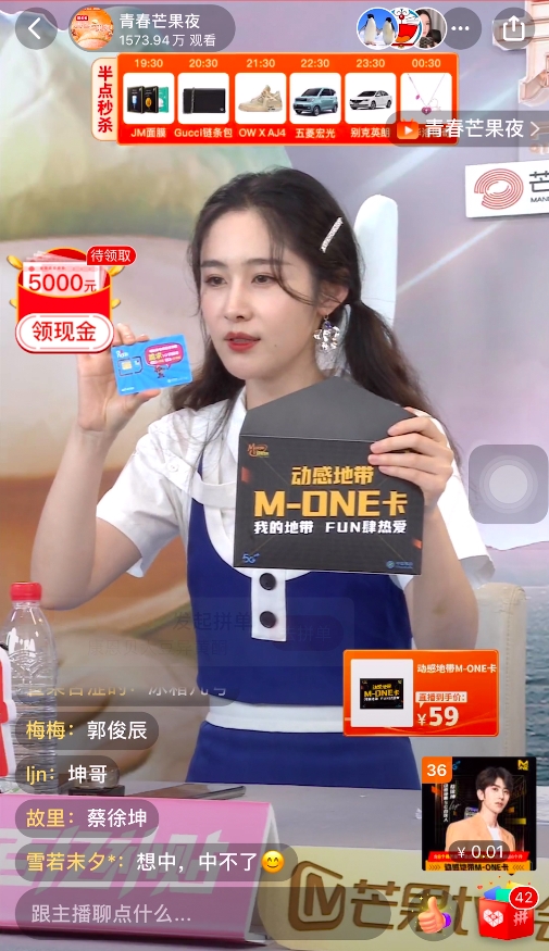 在后台直播间,主播通过拼多多直播安利动感地带M-ONE卡,超多权益和惊喜福利,让动感地带成为青春芒果夜的爆款。