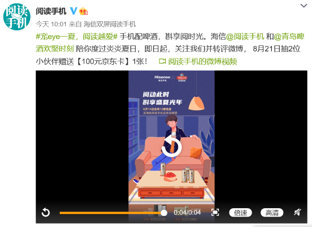 不止在京东,关注海信阅读手机、青岛啤酒的官方微博“阅读手机”、“青岛啤酒欢聚时刻”,并转发活动微博,即有机会获得100元京东卡一张或者海信阅读手机一部(8月21日开奖)。多多参与,有可能下个锦鲤就是你!