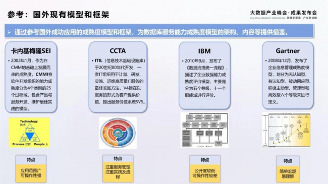 标准的制定参考了国外应用成熟度模型和框架,包括CMMI、CCTA、IBM发布的《数据治理统一流程》,以及Gartner发布的企业信息管理成熟度模型等,为《数据库服务能力成熟度模型》的架构内容提供借鉴。