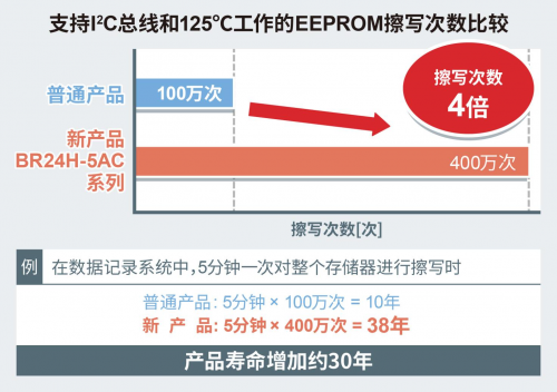 作为支持125℃的EEPROM,本系列产品实现了业界高水平的400万次的擦写次数。与普通产品100万次的擦写次数相比,本系列产品高出4倍,不仅有助于延长电子设备的使用寿命,还非常适用于必须频繁擦写数据的状态记录的应用。