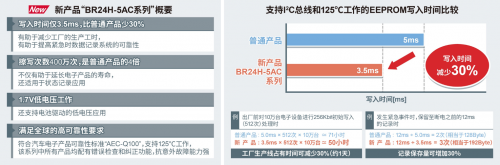 作为支持I2C总线和125℃的EEPROM,“BR24H-5AC系列”实现了3.5ms(毫秒)的高速写入。相比普通产品5ms的写入速度,写入时间可减少30%,因此有助于减少电子设备出厂前的EEPROM初始写入时间,并可以提高应急数据记录系统的可靠性。