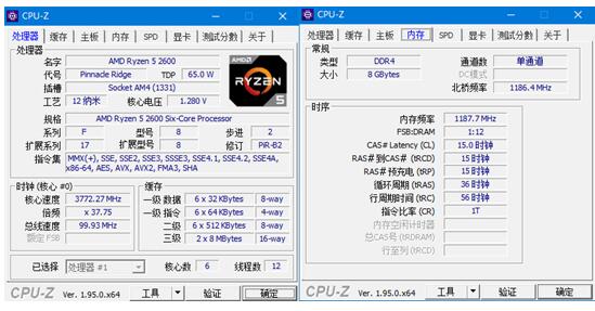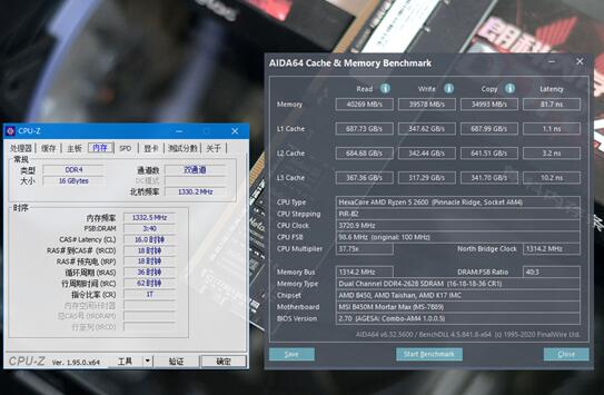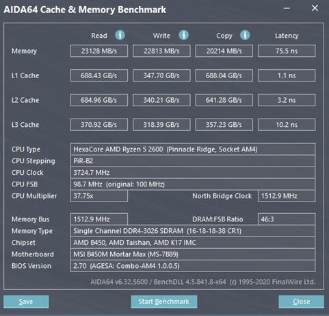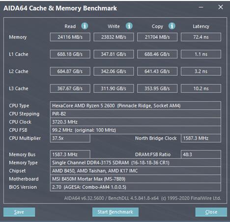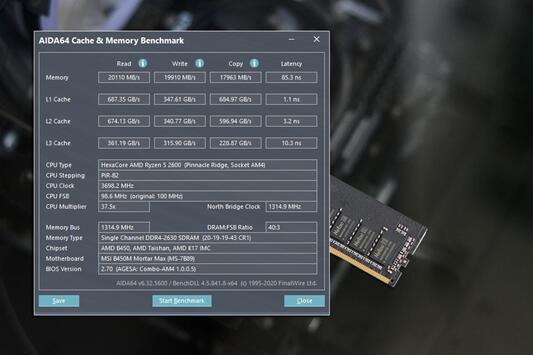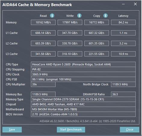 测试环境是AMD Ryzen5 2600加微星B450M的基本办公配置,并不是很高的配置。使用AIDA64在单通道2400MHz频率下测试成绩为:读取速度18162MB/s、写入速度17997MB/s、复制速度16772MB/s。