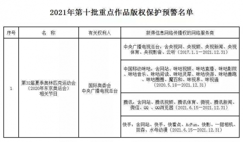 中宣部版权管理局副局长、一级巡视员汤兆志在讲话中指出,根据国际奥委会及重点赛事组织方相关诉求,“剑网2021”专项行动将体育赛事节目版权保护作为重点任务之一。当天,国家版权局也发布了2021年“第十批重点作品版权保护预警名单”——2020年东京奥运会相关节目,国家版权局将在三方面加大规范力度:一是重点打击公众账号特别是短视频、直播平台账号未经授权集中批量在网络平台上传、传播东京奥运会赛事节目的行为;二是严厉打击公众账号提供奥运会节目盗播链接的行为;三是着力整治网站、APP等未经授权非法转播奥运会赛事节目的行为。