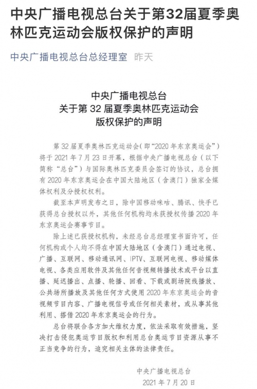 中央广播电视总台(简称“总台”)相关负责人在会议上介绍了总台奥运媒体权利及版权保护的基本情况。截至目前,除中国移动咪咕、腾讯、快手获得了总台授权以外,其他任何机构和个人均不得在中国大陆地区(含澳门)通过电视、广播、互联网、移动通讯网、IPTV、互联网电视、移动媒体电视、各类应用软件及其他任何音视频转播技术或平台以直播、延迟播出、点播、轮播、回看、下载或剧场院线播放、公共场所播放及其他方式使用本届奥运会的任何相关素材。该负责人表示,作为本届奥运会的持权转播方,总台将联合各方加大维权力度,依法采取有效措施,坚决打击侵犯奥运节目版权和利用总台奥运节目资源从事不正当竞争的行为,并追究相关主体的法律责任。