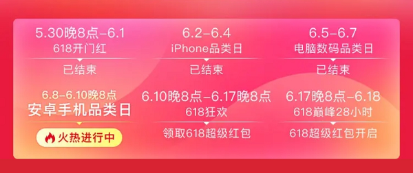从6月10日晚8点开始,618巅峰28小时活动进入预热阶段,狂欢盛宴开启,手机、电脑、平板等全品类产品大促,除了1元限购红包参与减免外,还有618元超级红包,优惠力度再上一层楼!