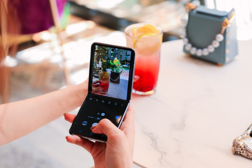 正如一万个人眼中有一万个哈姆雷特,面对气势磅礴的山峦、胸怀万物的大海,每个人的视角和感受都是不同的。使用三星Galaxy Z Flip 5G拍摄,能够让你更轻松的找到和记录下自己眼中独一无二的风景。将三星Galaxy Z Flip 5G的下面部分放于你的掌心,然后借助多角度旋停功能,可以让上部分屏幕自由翻折到任意角度。午后和闺蜜的路边下午茶,即便一杯果汁,也能在不同的视角下完成七十二变。
