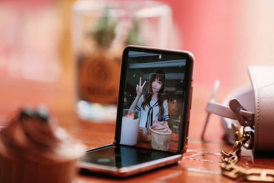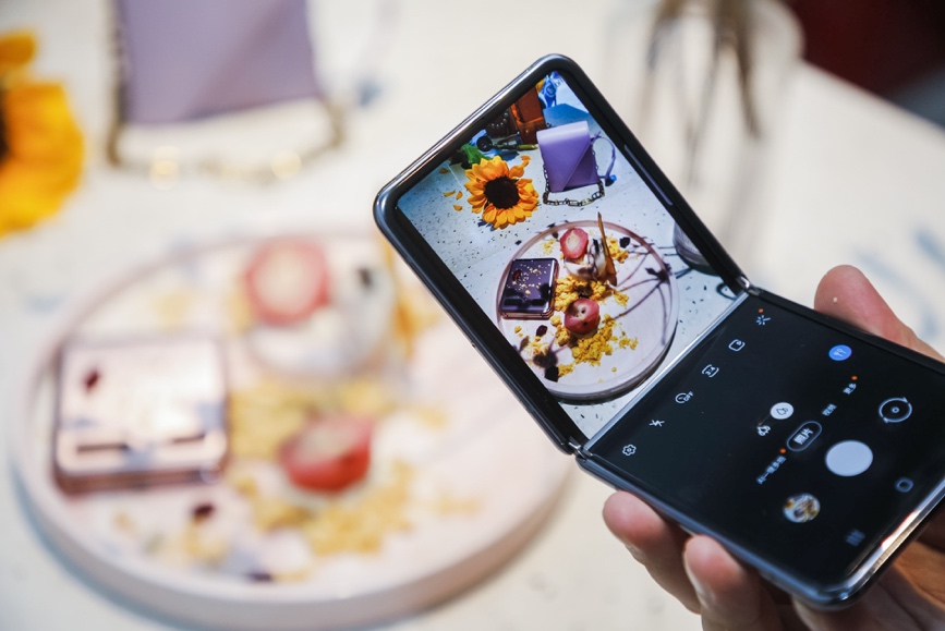 旅拍必带三脚架,如今可以成为过去时了。特别在自拍时,不想拍摄大头照,那就用三星Galaxy Z Flip 5G搞定。将三星Galaxy Z Flip 5G放在桌面上,翻折调整到合适的角度,在借助精致的甜品做装饰,摆出甜美或搞笑的姿势,通过手势控制,一张像他拍一样的自拍美照就顺利出炉了。